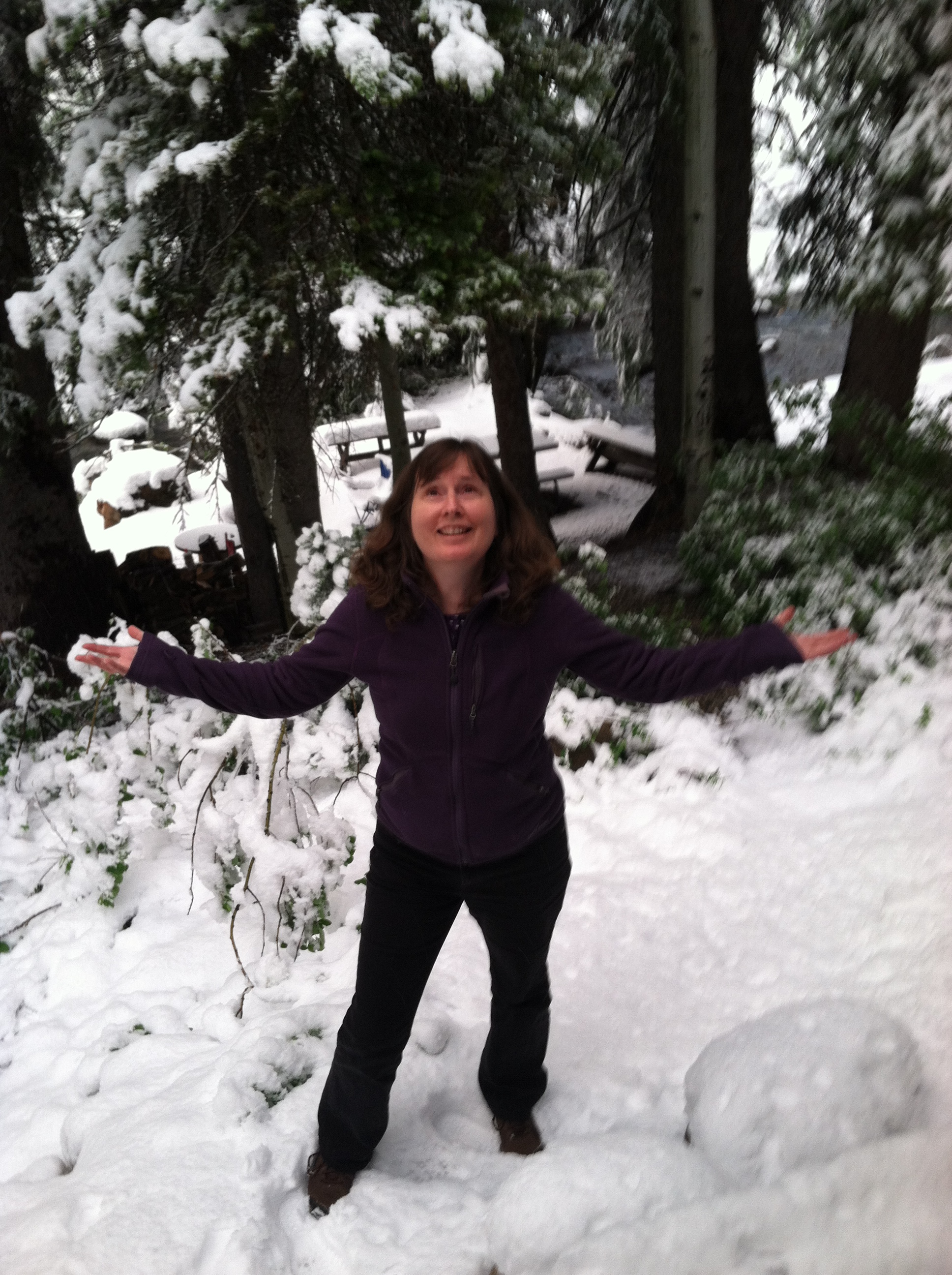 The problem with my daughter’s decision to get married on a mountain top was that there are many mountain tops and many locations on a mountain top.  Choosing the perfect one is difficult…and the other issue is that snow is a common occurrence on mountain tops, so it is difficult to plan a specific location until all of the snow melts.  When we arrived on Tuesday, June 17th to six beautiful newly fallen inches of snow and power lines down on the driveway cutting off electricity to our cabin, improvisation skills became important!  2014-06-17 20.26.46(What have I been practicing and teaching in InterPlay classes for years?  Take a deep breath and let it out with a sigh!  Shake it out!)  Then we began looking for what we could create with.  What did this cabin have that might help us weather the evening without power?  (It’s about what a body can do!  I also knew that witnessing is an important element so I posted a photo of my situation on Facebook!  The responses were comforting…not being alone in my story increased my resolve to be creative. And taking photos helped me witness the weather with a smile of irony. Snow in June? Really?)  2014-06-17 20.44.17We had a gas stove…so there was a light source and we could boil water and heat up soup.  The people who owned the cabin checked on us by phone, and they gave us clues to where a flashlight was hidden. They informed us that there were down comforters on the bed that could help us stay warm.  I had brought a couple of candles that I thought might become part of the wedding…but instead they provided another light source for the evening.    There was a bed and breakfast nearby that still had power,  so we took our electronic devices there to get recharged and to hang out for awhile.  We could listen to podcasts and read to each other from our Kindles.